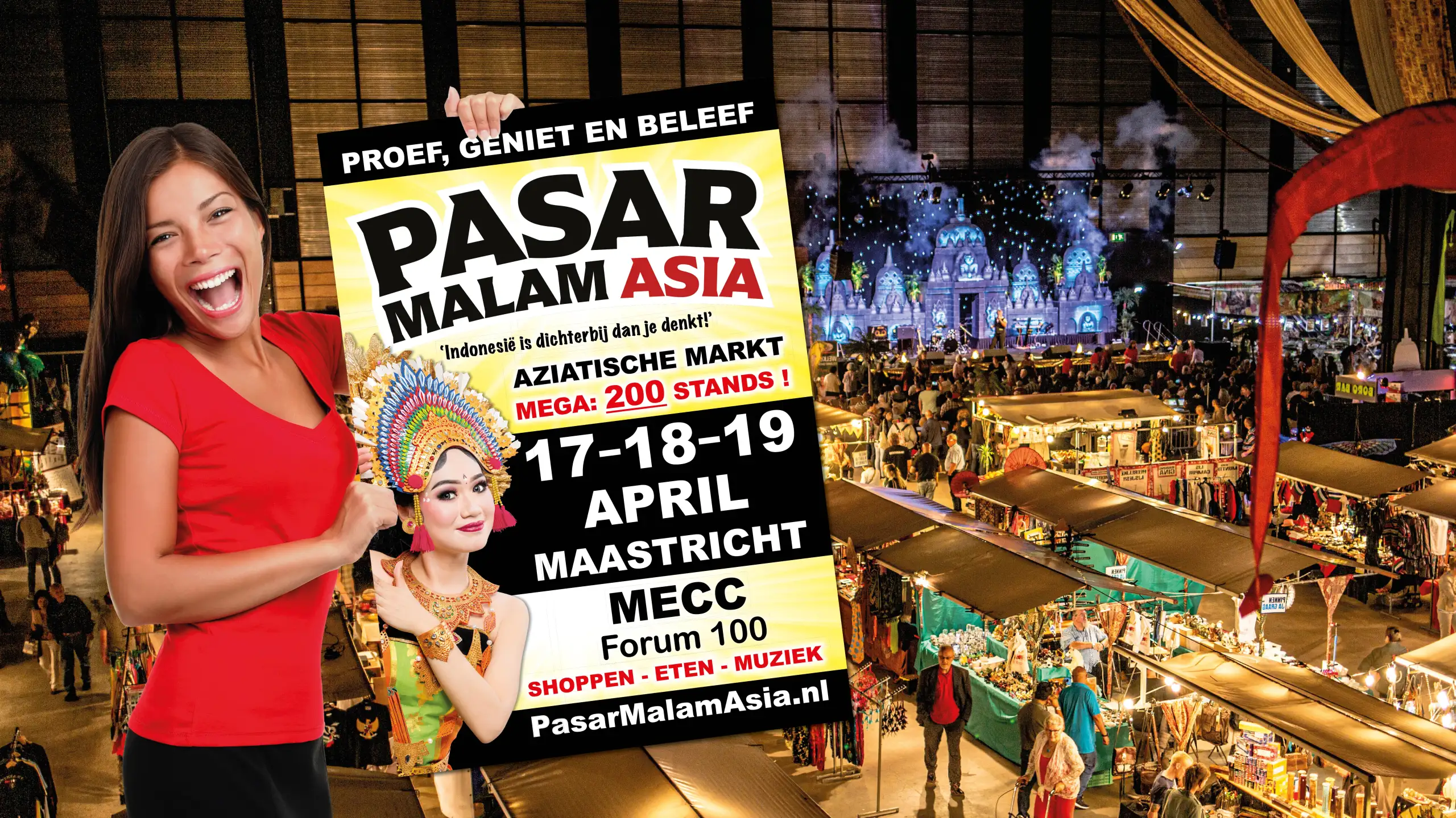 Beleef het mooiste en meest onderscheidende Aziatische festival van Nederland tijdens Pasar Malam Asia in MECC Maastricht. Met meer dan 200 stands kun je eindeloos shoppen, genieten van heerlijke Aziatische gerechten en livemuziek. De mix van geuren, smaken en cultuur zorgt voor een unieke en authentieke sfeer die je niet wilt missen. Tickets kosten €10,- voor volwassenen en €5,- voor kinderen van 4 t/m 11 jaar.